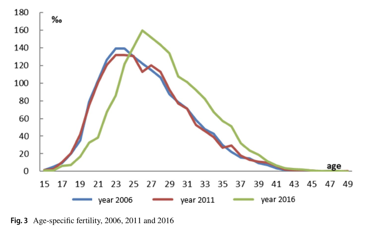 Date: 2026-01-20 09:44 pm (UTC)Но этот эффект вряд ли даст уменьшение TFR больше, чем на 10%, потому что распределение не может вдруг взять да и скакнуть на много лет вперёд в среднем, ему просто некуда. Вот график этого распределения в Китае за 2006-2016 годы, из этой статьи. Видно, что оно действительно стояло на месте, а потом сдвинулось направо года эдак на два. Этот сдвиг произошёл _до_ резкого падения TFR. Вполне вероятно, что он продолжился и после 2016 года, тогда он действительно внёс какой-то небольшой временный вклад в падение TFR за 2018-25. А та часть сдвига, которая была до падения, наоборот, должна была чуточку подтолкнуть TFR во время падения вверх, за счёт реализации отложенных рождений. В общем, падение TFR от ~1.6 до <0.9 одним этим не объяснить.